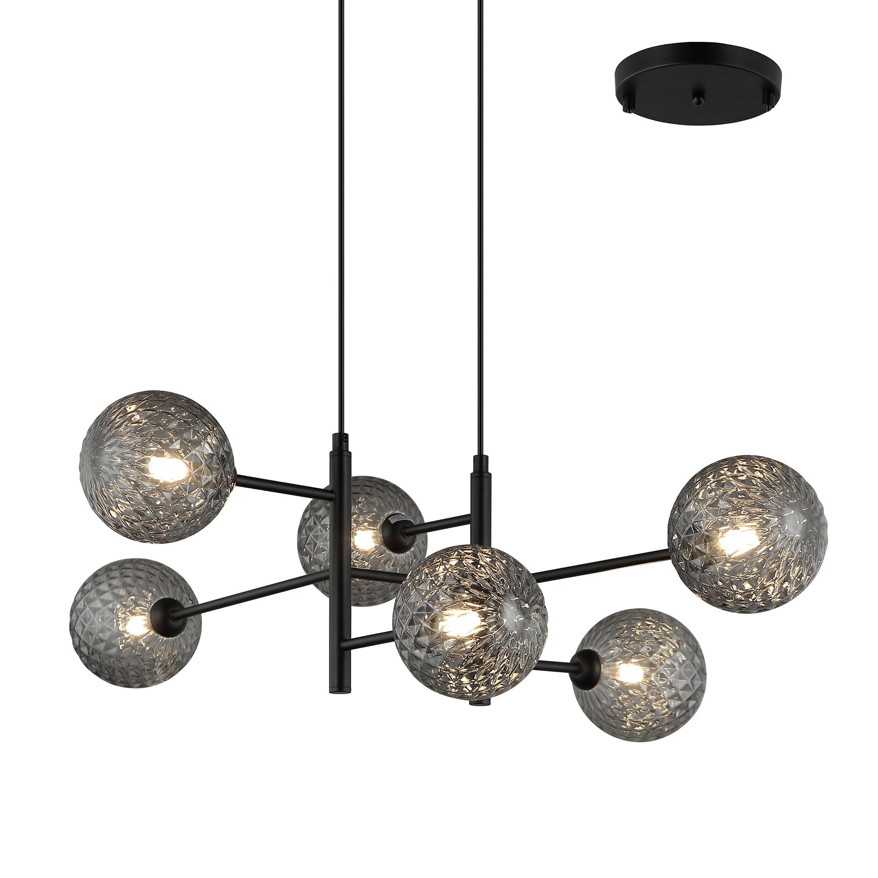 Elevate your space with the Tabora Black and Smoke 6 Light Modern Pendant, featuring a sleek cluster design and intricately patterned glass shades. Its sophisticated blend of black and smoky tones creates a captivating ambiance while casting beautiful light patterns. Perfect for contemporary interiors, this pendant adds both style and refined illumination to your living or dining area.